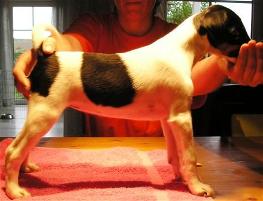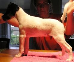 Hier ein erstes Fotos von mir in Ausstellungs-Pose... O.k. wir müssen definitiv noch hart an einer korrekten "Stehtposition" arbeiten, aber fürs Erste muss das hier reichen. Außerdem trete ic gerade in die Dackelphase und werde gaaanz lang im Rücken. Zusammen mit meinen Ohren könnte ich fast als Dackeline durchgehen. In ein paar Wochen sieht das aber schon wieder ganz anders aus ;)