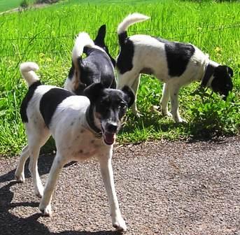 Vorne Beany, dahinter Arwen, die Banyas Hinterteil beschnüffelt.