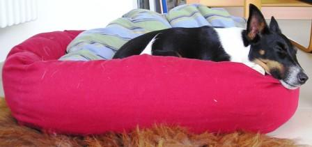 Arwen schläft zufrieden in ihrem Körbchen.