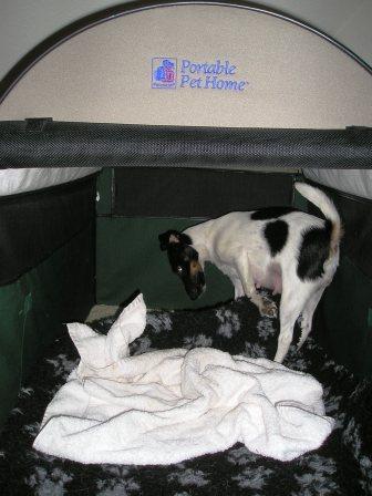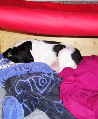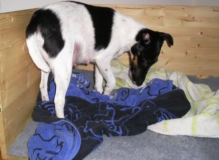 Um Banya das heiß geliebte Höhlen-Feeling zu vermitteln, habe ich eine Decke über die Wurfkiste gelegt und unser Betttuch dazu gepackt. Letzteres, weil Banya sich schon auf den Weg ins Schlafzimmer begeben hat, was ich wiederum bei aller Liebe nicht tolerieren kann ;). Das Betttuch hat sie sehr glücklich gemacht.