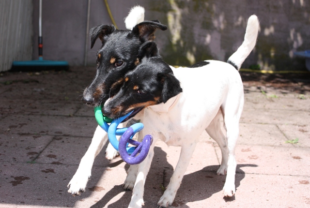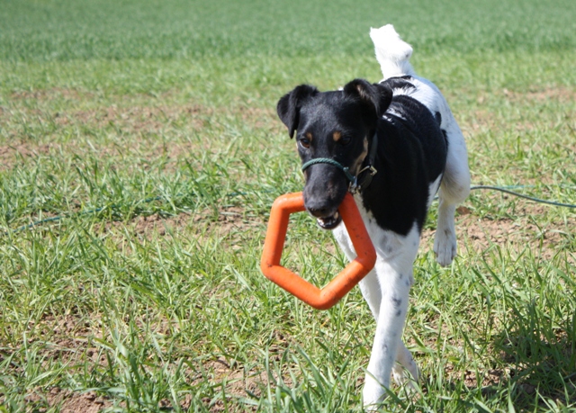 Lektion 4 für Darin: Spiel mit Menschen bedeutet Spaß - Lerneffekt: Zerren ist toll und auf "Aus" geht's meist auch weiter mit dem Spiel! Nach zweimaligen Schleuder-Spielen bringt Darin das Gummi-Spieli freudig, voher lief er damit weg. Fazit: sein Knurren wurde als Aggression gedeutet, war aber Spielaufforderung.