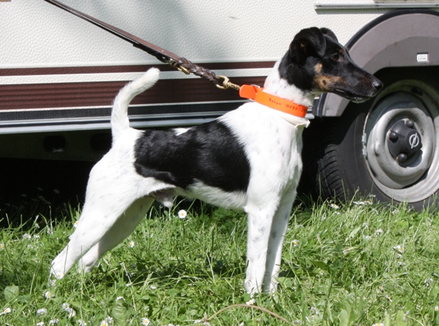 9 Monate alter schwarz-weißer Rüde, guter Kopf mit kleinen hoch angesetzten und vzgl. getragnen Ohren, gute Hals-Schulter-Linie, genügend kurz im Rücken, schmale Front, gute Läufe und Pfoten, Gangwerk könnte etwas Raumgreifender sein - SG3.