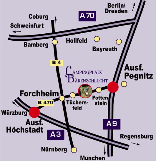 Der Campingplatz Bärenschlucht liegt direkt an der B 470 zwischen Forchheim und Pegnitz!